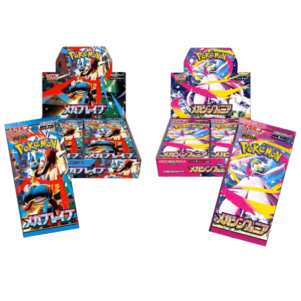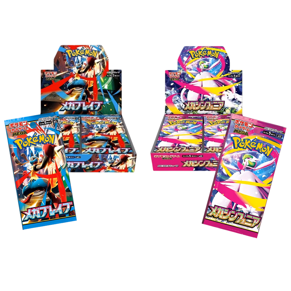 Due esclusive espansioni giapponesi che celebrano il potere delle Mega Evoluzioni: Mega Brave, con protagonista Mega Lucario, e Mega Symphonia, dedicata all’eleganza di Mega Gardevoir. Ogni box contiene pacchetti sigillati.